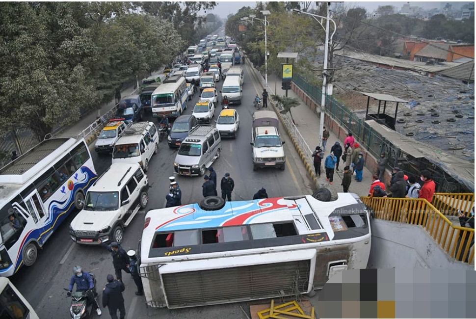 १ माघ, काठमाडौं । रत्नपार्क–भद्रकाली सडकखण्डमा बा ३ ख ४४३७ नम्बरको एक यात्रुबाहक बस दुर्घटना भएको छ । भद्रकाली नजिकैको आकासे पुलनेर बिहीबार बिहान ७ः५५ बजेतिर बस सडकमै पल्टिएको हो ।