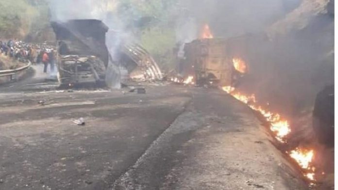 पेट्रोलियम पदार्थ बोकेको ट्याङ्करसँग ठोकिएर बसमा समेत आगलागी भएको अधिकारीहरूले जनाएका छन्।